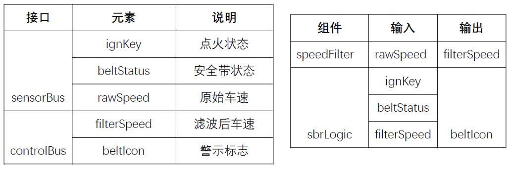我们以简化的安全带警示系统作为案例,有驾驶经验的用户应该熟悉基本工作原理:在行驶状态下如果系统检测到驾驶员未系安全带应该发出声光提示。系统输入包括点火钥匙信号、安全带状态信号和原始车速信号,系统输出为安全带警示灯驱动信号。原始车速信号通常需要经过滤波后才能作为控制信号使用。