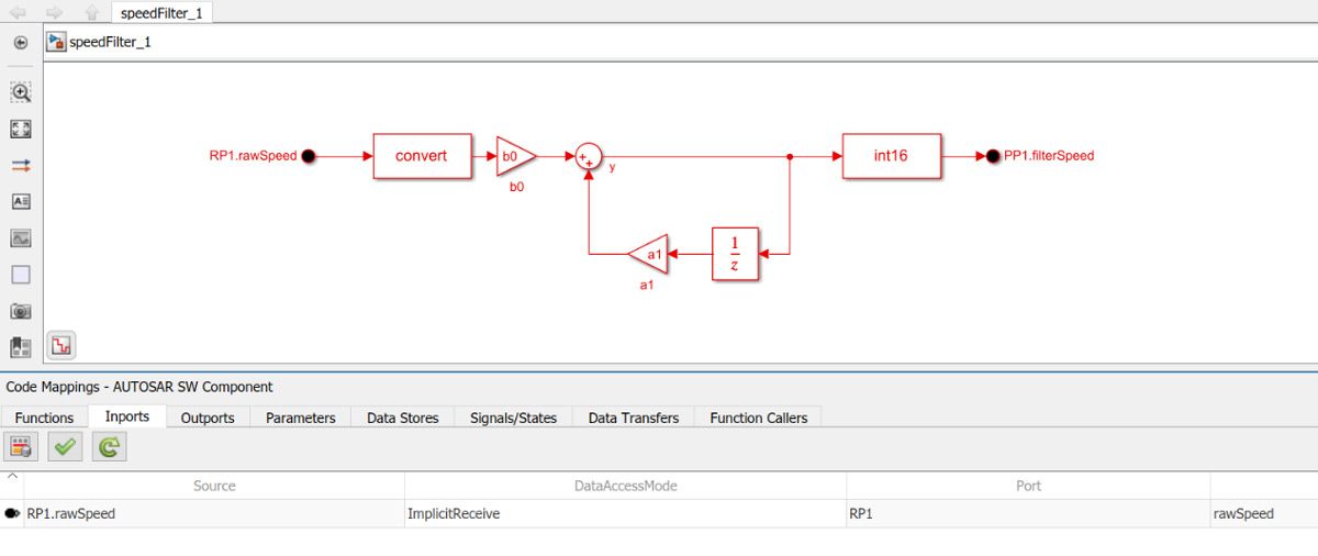 默认情况下端口的所有元素都会生成,设计时可以根据算法需要删减。车速滤波SWC和警示逻辑SWC的算法设计分别如下: