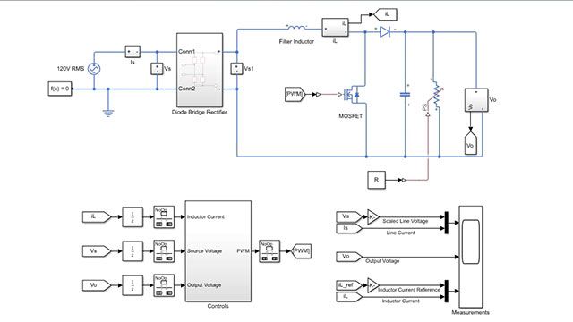 Modellierung der Leistungsfaktorkorrektur für einen Aufwärtswandler im kontinuierlichen Durchlassmodus (CCM) in Simscape Electrical (siehe Beispiel).