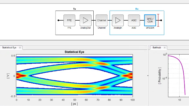 Entwerfen, konfigurieren und analysieren Sie SerDes-Systeme mit der SerDes Designer-App. Erstellen Sie SerDes-Pläne und prüfen Sie Leistungsmetriken, wie COM, BER, Badewannenkurven sowie weitere Visualisierungen. Erzeugen Sie Simulink und IBIS-AMI-Modelle zur weiteren Verbesserung und Nachprüfung.