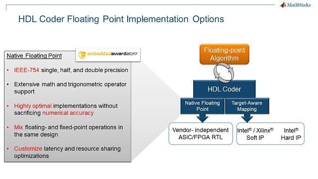 Generieren Sie target-unabhängigen synthetisierbaren VHDL- oder Verilog-Code direkt aus Single-, Double- oder Half-Precision-Gleitkommamodellen.