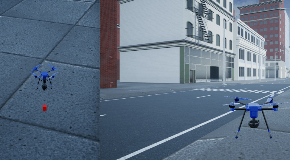 Up to this point, the environment is a simple cuboid scenario. To increase the fidelity of the environment, click the Photorealistic Simulation shortcut. This shortcut places the aircraft in a more realistic world to fly through. The PhotorealisticQuadrotor variant located at asbPackageDelivery/photorealisticSimulationEngi/SimulationEnvironmentVariant becomes active. This variant contains the necessary blocks to configure the simulation environment and the sensors mounted on the aircraft: