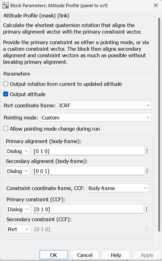 The desired attitude is nadir pointing, with the spacecraft body-z axis pointing nadir and the body-x axis aligning with the ICRF velocity vector. Therefore, the primary alignment vector is the body-z axis, the primary constraint vector is the unit vector pointing towards nadir, the secondary alignment vector is the body-x axis, and the secondary constraint vector is the unit vector along the ICRF velocity direction. Accordingly, the Pointing mode parameter of the Attitude Profile block is set to "Point at nadir", automatically setting the primary constraint vector to the nadir direction. The primary and the secondary alignment vectors are set to the body-z and x axes, respectively. The secondary constraint vector, the unit ICRF velocity vector, is input through the port C2icrf.
