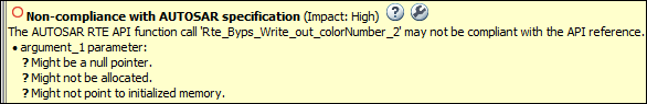 The fix depends on the root cause of the defect. To diagnose this check, read the message on the Result Details pane. The message shows all checks performed on the RTE API function, along with information about whether the check passed. For instance, this message: