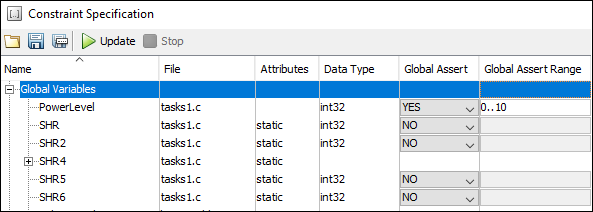 </file>To specify a constraint on a global variable and check during a Code Prover analysis if the constraint is violated:
