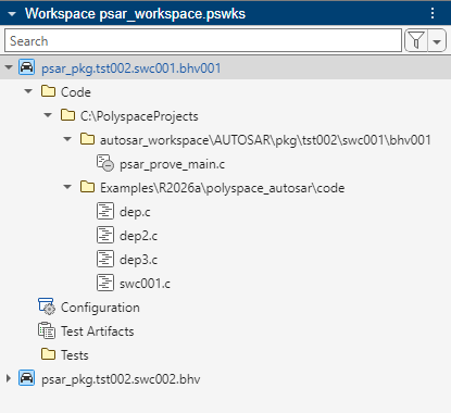 Using the information in the AUTOSAR XML, Polyspace for AUTOSAR creates a workspace with a separate project for each software component. In a single project, Polyspace collects the source code (.c and .h files) containing the implementation of all runnables in the software component and generates any additional header file required for the implementation.