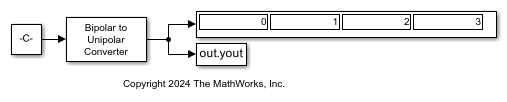 The Bipolar to Unipolar Converter block maps the bipolar input signal to a unipolar output signal.