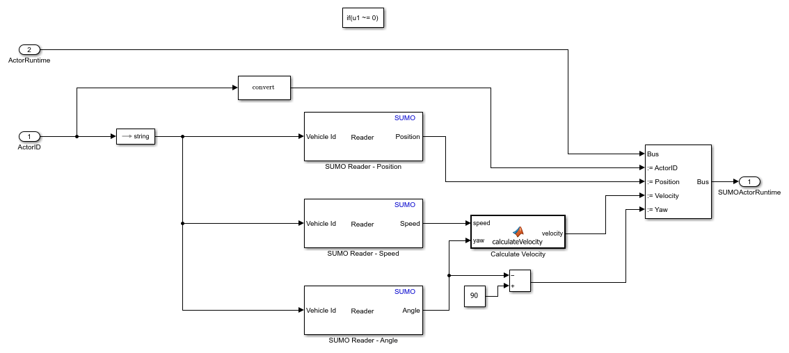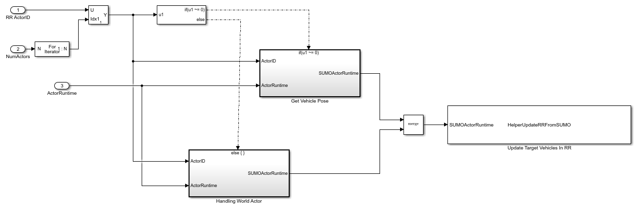 For all SUMO vehicles, the Reader block converts the Actor Id value from RoadRunner to a string scalar, and uses that value to read position, speed, and angle of the corresponding vehicle in the SUMO simulation.. The HelperUpdateRRFromSUMO System object uses the ActorSimulation object to write these values to RoadRunner. Open the Get Vehicle Pose subsystem.