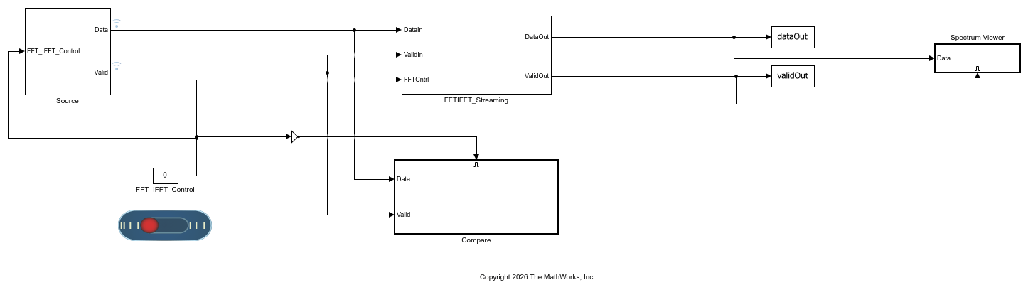 Use the toggle switch to select between FFT and IFFT modes. Set FFT_IFFT_Control signal to 0 for IFFT mode or to 1 for FFT mode. The switch enables or disables the swapping logic inside the FFTIFFT_Streaming subsystem and modifies the source output.
