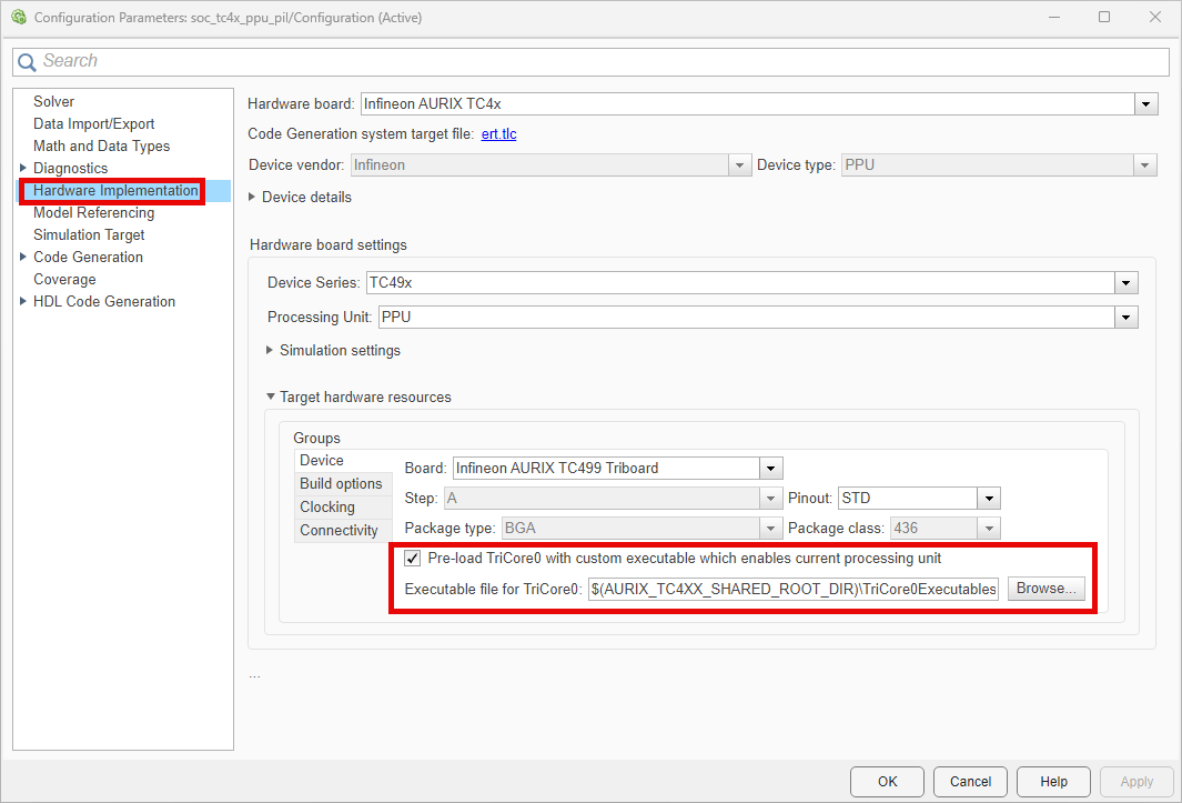 3. Navigate to Hardware Implementation > Hardware board settings > Target hardware resources > Device and enable Pre-load TriCore0 with custom executable which enables current processing unit parameter. The TriCore0 is the principal processing unit that handles system initialization, boot processes, and critical control tasks in the Infineon AURIX microcontrollers. Application models using processing units other than TriCore 0 must enable Pre-load TriCore0 with custom executable which enables current processing unit parameter to initialize these processing units.