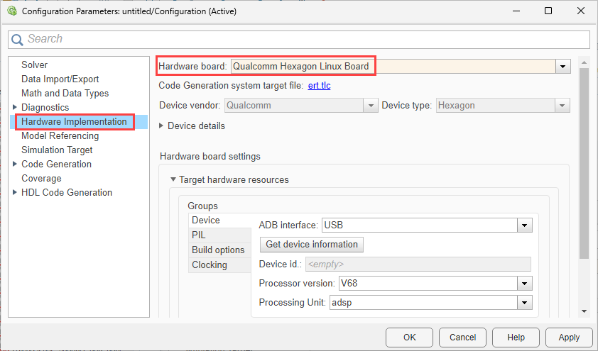 Qualcomm Hexagon Linux Board.The parameter values under Hardware board settings are automatically populated to their default values.