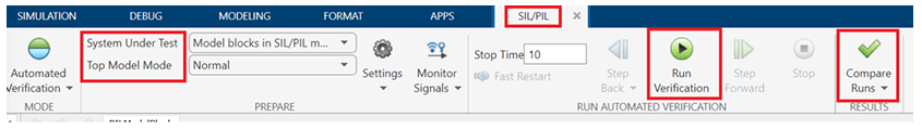 4. Click Run Verification to start the simulation. Compare option displays the numerical equivalence between PIL simulation output and the normal mode simulation output.