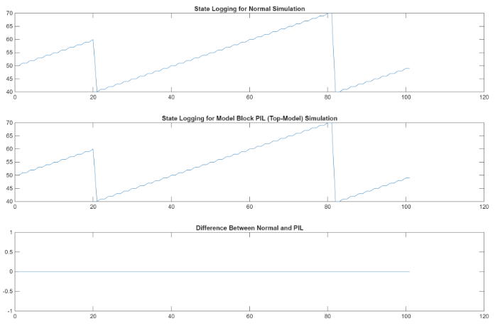 PIL mode: yout2 = out2.logsOut; yout2_pil = yout2.get('counterOut').Values.Data; xout2 = out2.xout; xout2_pil = xout2{1}.Values.Data; Normal Mode: set_param([model '/Counter'],"SimulationMode","Normal"); out2 = sim(model,20); yout2 = out2.logsOut; yout2_normal = yout2.get('counterOut').Values.Data; xout2 = out2.xout; xout2_normal = xout2{1}.Values.Data; fig3 = figure; subplot(3,1,1), plot(yout2_normal), title('Counter Output for Normal Simulation') subplot(3,1,2), ... plot(yout2_pil), title('Counter Output for Model Block PIL (Model Reference) Simulation') subplot(3,1,3), plot(yout2_normal-yout2_pil), ... title('Difference Between Normal and PIL'); fig4 = figure; subplot(3,1,1), plot(xout2_pil), title('State Logging for Normal Simulation') subplot(3,1,2), ... plot(xout2_normal), title('State Logging for Model Block PIL (Model Reference) Simulation') subplot(3,1,3), plot(xout2_normal-xout2_pil), ... title('Difference Between Normal and PIL');