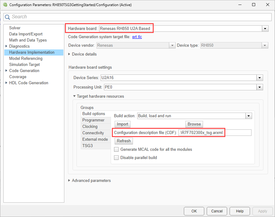 • R7F702300x_tsg.arxml is added as the configuration description file in Build options. To verify click Modeling > Model Settings to open the Configuration Parameters dialog box. Navigate to Hardware Implementation > Target hardware resources > Build options.