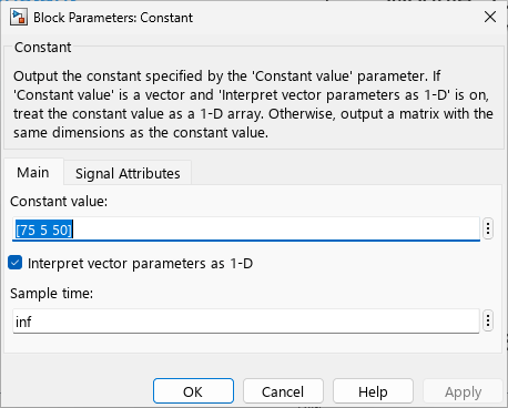 Double click the Constant block to open the block parameters dialog.