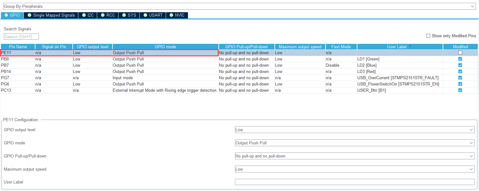2. This example includes an STM32 CubeMX project file i2c_lis3dh_freefall.ioc that configures I/O connections for code generation. As shown in Getting Started with STMicroelectronics STM32 Processor Based Boards, you can browse to the project file from the Configuration Parameters dialog box. Or, you could use the STM32 CubeMX software to create a project file. Launch the STM32CubeMX project in the STM32CubeMX tool and apply configurations to enable to GPIO as shown in STM32 CubeMX.