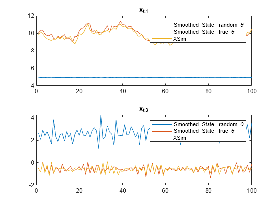 figure tiledlayout(2,1) nexttile plot([SmoothX(:,1) SmoothXSim(:,1) XSim(:,1)]) title("x_{t,1}") legend("Smoothed State, random \theta","Smoothed State, true \theta","XSim") nexttile plot([SmoothX(:,3) SmoothXSim(:,3) XSim(:,2)]) title("x_{t,3}") legend("Smoothed State, random \theta","Smoothed State, true \theta","XSim")