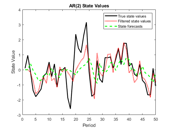 figure plot(1:T,x(:,1),'-k',1:T,FilteredStates(:,1),':r',... 1:T,ForecastedStates(:,1),'--g','LineWidth',2); title('AR(2) State Values') xlabel('Period') ylabel('State Value') legend({'True state values','Filtered state values','State forecasts'}); figure plot(1:T,x(:,2),'-k',1:T,FilteredStates(:,2),':r',... 1:T,ForecastedStates(:,2),'--g','LineWidth',2); title('MA(1) State Values') xlabel('Period') ylabel('State Value') legend({'True state values','Filtered state values','State forecasts'});
