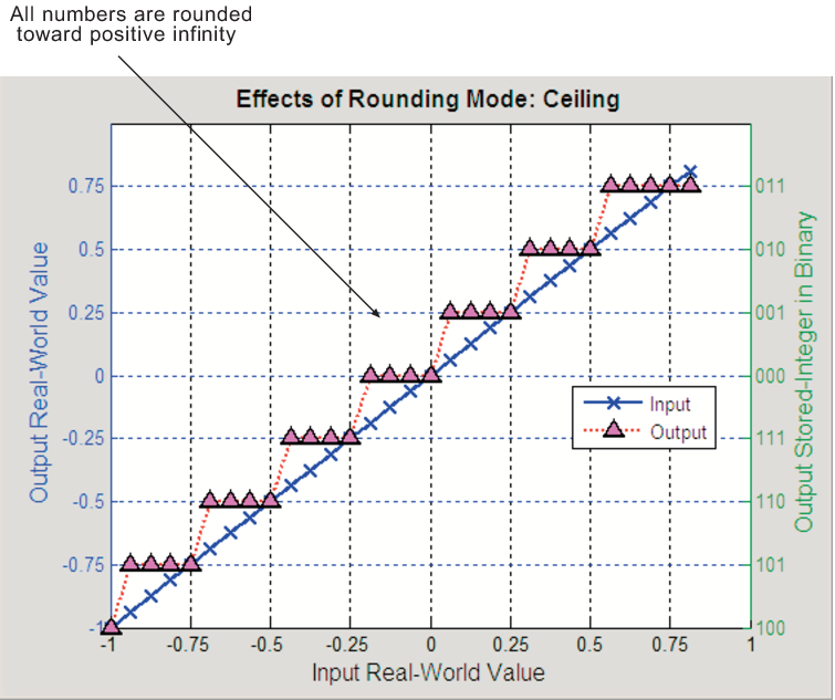 Plot of output stored integer value vs input real-world value using round to ceiling.