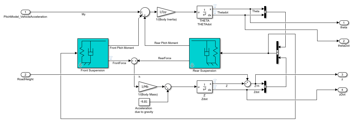 Open the suspensionModel_halfCar model. This is a simplified mathematical model of a vehicle's front and rear suspension system which can be used to study it's ride characteristics. The two inputs to this model are the pitch moment induced due to the vehicle's acceleration and the change in the road height that it travels on. For more information about this model, see Automotive Suspension.