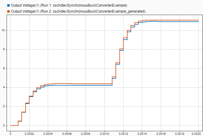 You can see the output waveform and compare the Simscape model and the generated optimized model. To see the waveform, double-click the Data Logger on top of the output signals and open the Simulation Data Inspector.