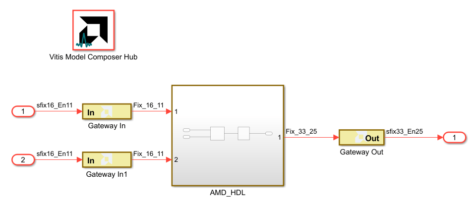 subsystem connect to Gateway IN and Gateway Out blocks. The Vitis Model Composer Hub block is at the top of the subsystem hierarchy. The AMD_HDL