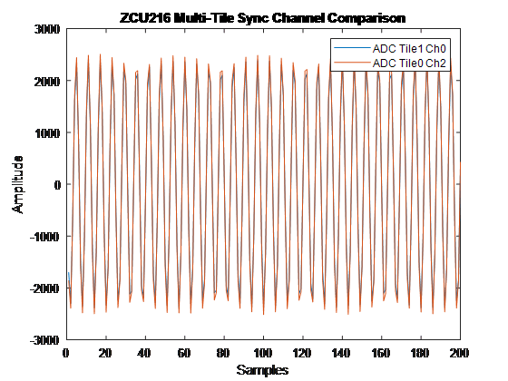 The graph above shows the result of data capture from a ZCU216 board for two channels, ADC Tile 1 Channel 0 and ADC Tile 0 Channel 2. It demonstrates near-perfect alignment between the channels.