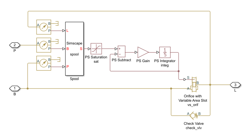 The pressure sensors measure pressure at respective ports and convey their values to the Fcn block, which, together with the PS Saturation block, performs calculations in accordance with Equation 3. The valve displacement is passed through the first order lag block, built of the PS Subtract, PS Gain, and PS Integrator blocks, to account for valve dynamics. The gain of the PS Gain block is set to 1/T, where T is the time constant. The Variable Orifice and Check Valve blocks simulate the counterbalance valve orifice and check valve. In the actual Counterbalance Valve block model, the operations performed by the sensors and the Fcn block are executed in the block equation section.