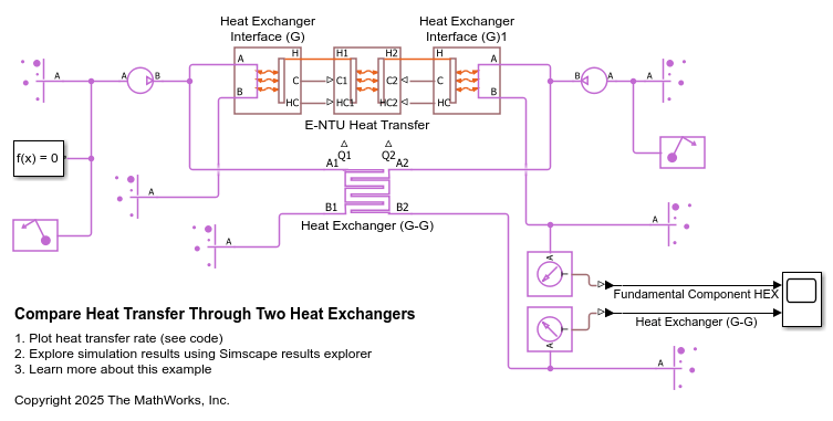 The Heat Exchanger Interface (G) block models thermal transfer by a gaseous flow within a heat exchanger. Use a second heat exchanger block to model the fluid pair. The interfaces can be in different fluid domains, such as one in liquid and one in gas. Use an E-NTU Heat Transfer block to couple the interfaces and capture the heat exchange between the fluids.