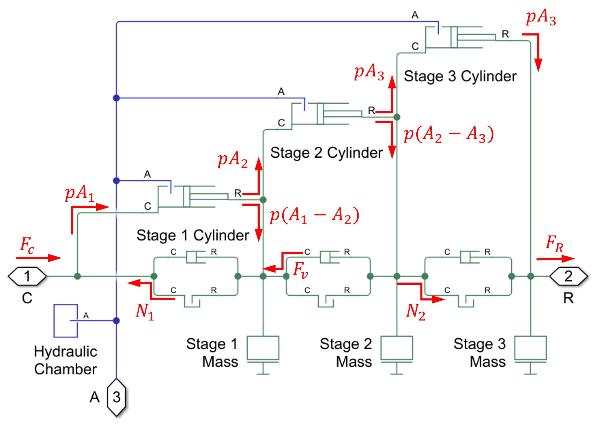 where and are the forces at port C and R, respectively, and represents a hard-stop force, and is the viscous force associated to the movement of the second stage. The sum of all equations gives . The diagram shows how the forces on the free body diagrams manifest across the network.