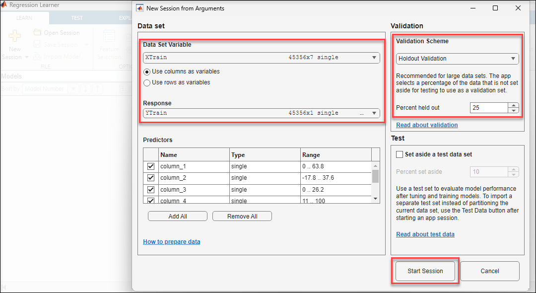 1. In the New Session from Arguments dialog box, verify the Data Set Variable and Response. Select Holdout Validation scheme and click Start Session.
