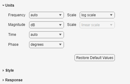 autooption usesrad/TimeUnitas the frequency units relative to the system time units, whereTimeUnitis the system time units specified in theTimeUnitproperty of the system on frequency-domain plots. For multiple systems with different time units, the units of the first system is used.For the frequency axis, you can select logarithmic or linear scales.