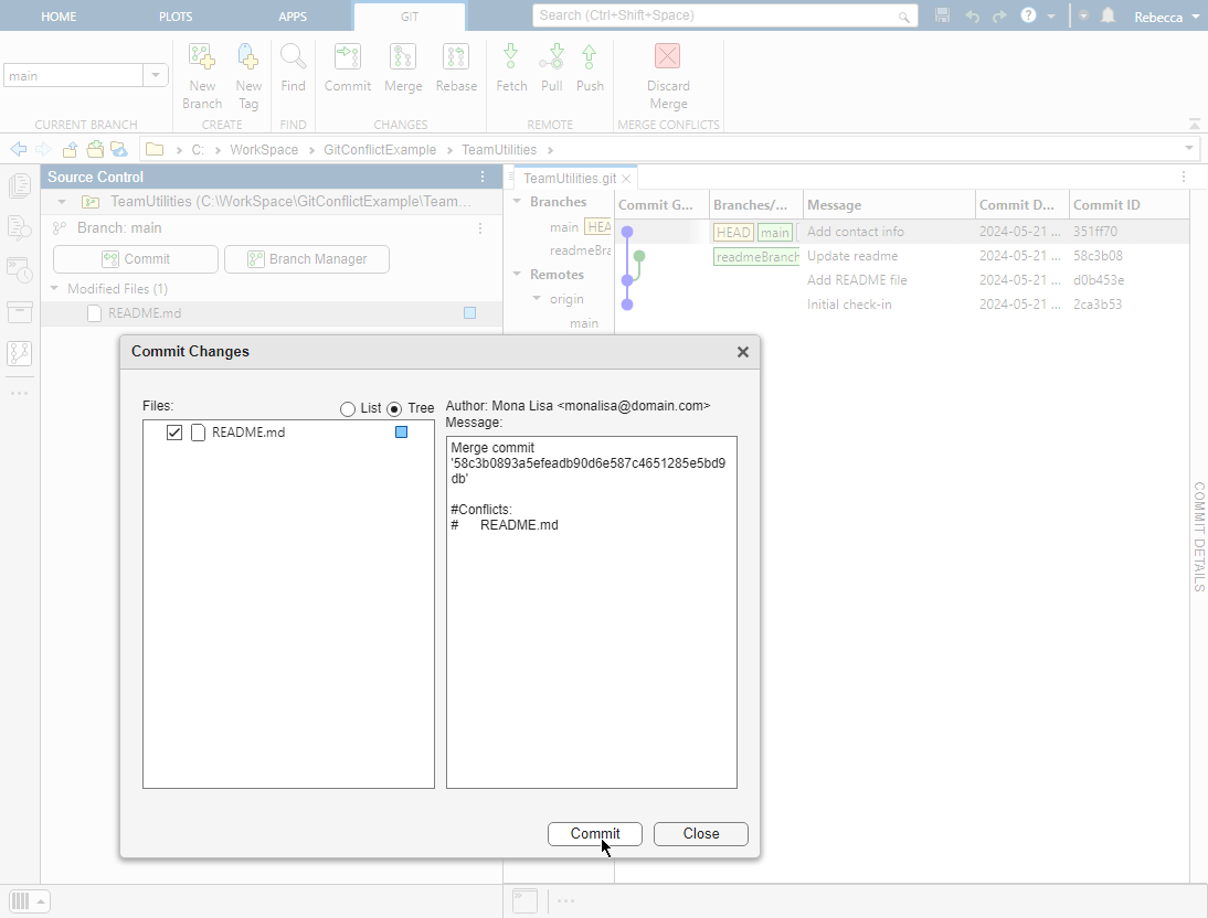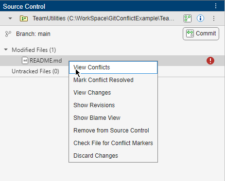 This example shows how to resolve a conflict when you collaborate on files that are under Git™ source control. You create a new branch, make changes, then merge the changes into the main branch. The branch merge causes a conflict.