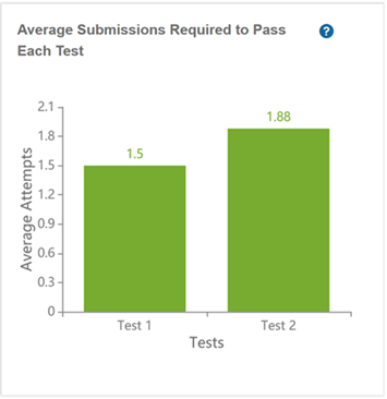 The following image shows an example of an average submissions graph. In it, you can see that learners required an average of 1.5 attempts to pass Test 1, and learners required an average of 1.88 attempts to pass Test 2.