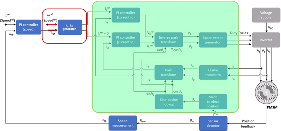 Inputs: The controller receives the real-time motor speed () and the torque reference () from the outer control loop.