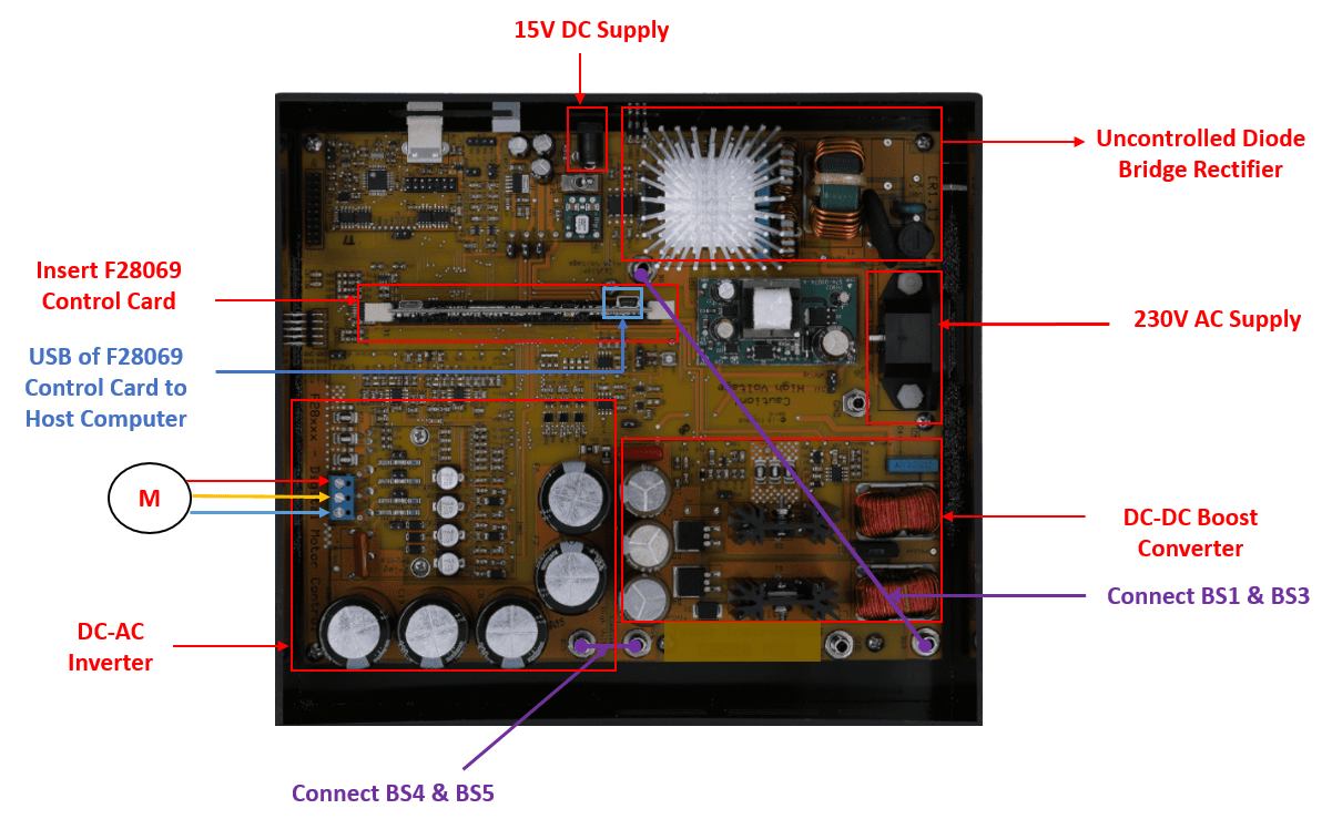 The High voltage motor control kit (TMDSHVMTRINSPIN) configuration includes the following hardware components: