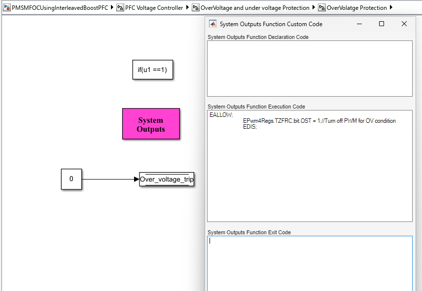 An overvoltage protection mechanism is implemented using custom code in System Outputs block. The sensed DC bus output voltage from the ADC input is compared against the overvoltage protection threshold set in the initialization script file. Vpfc_trip_level is the overvoltage threshold point which is set to 430 V for the model. When overvoltage condition is met, the one-shot trip in ePWM is enabled.
