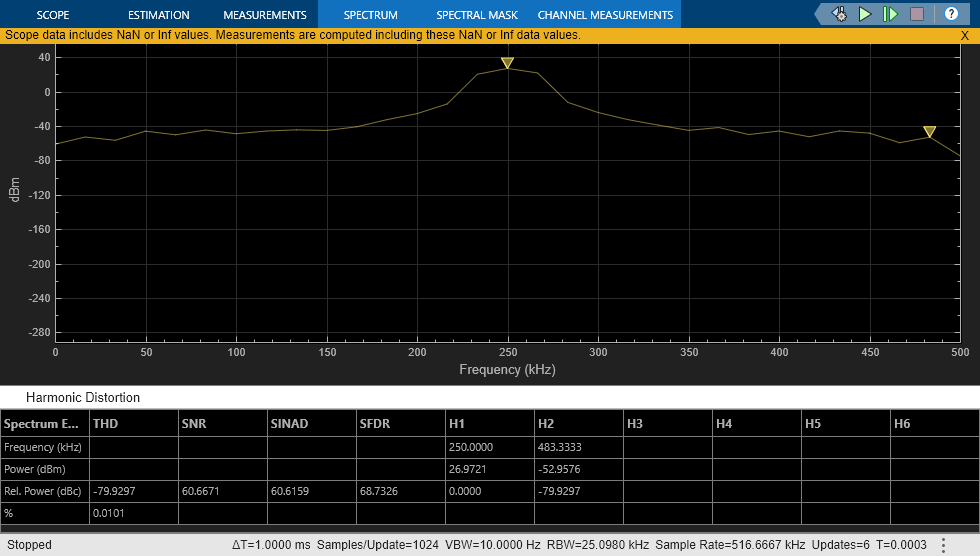 This example shows how to find the AC performance metrics such as SNR, SINAD, SFDR, ENOB, and noise floor using a DAC AC Measurement block.