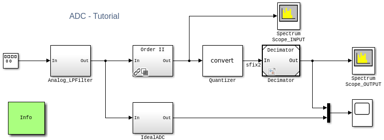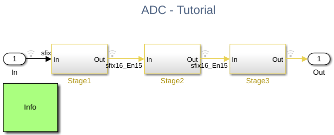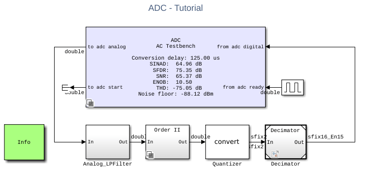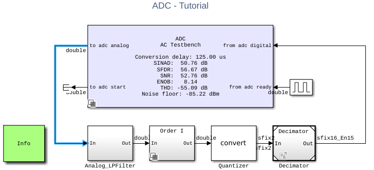 The MSADCTutorial_Model3_1 model allows the simulation of the ADC using the different implementations created in the System-Level Model of DSM ADC example.