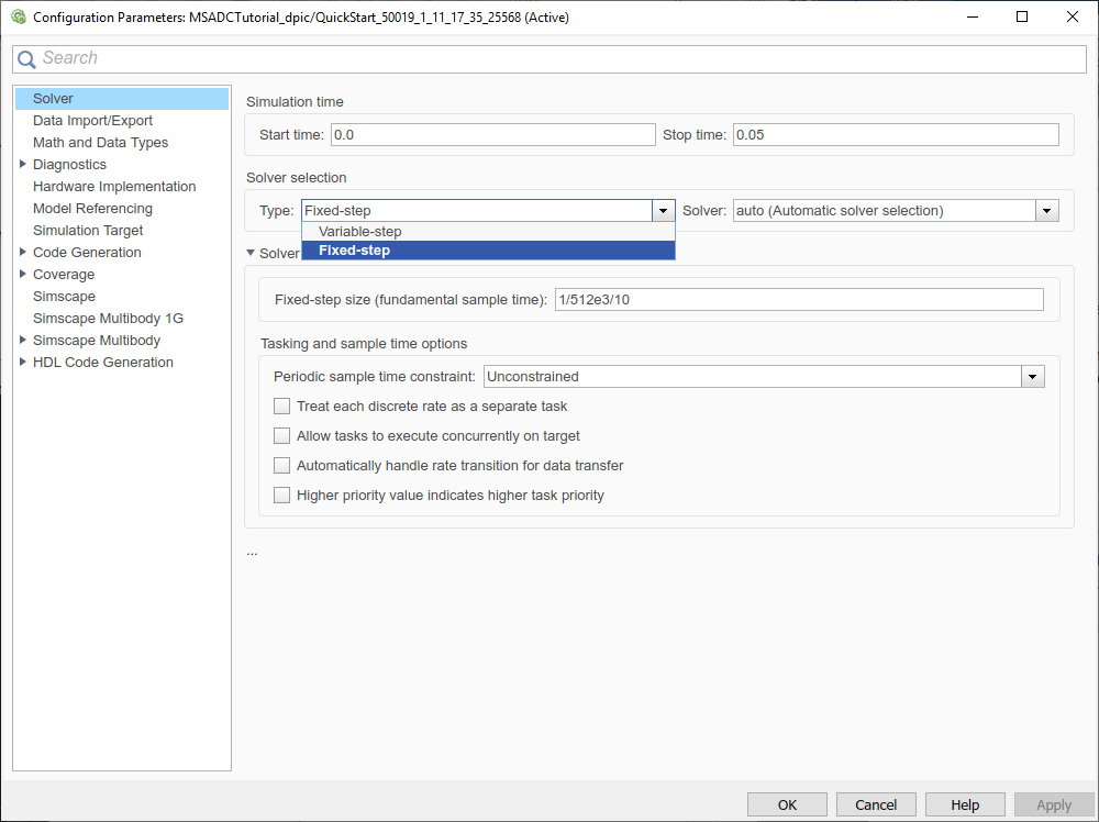 The first and most critical step is to use a fixed step solver, as the generated C code needs to have a fixed notion of time to operate on and update its internal states. You must choose the fixed step size greater than the sampling rate or frequency of the internal signals, to capture the block functionality while minimizing the error introduced when changing the solver configuration. To change the solver, open the model configuration parameter and change type in the solver tab.
