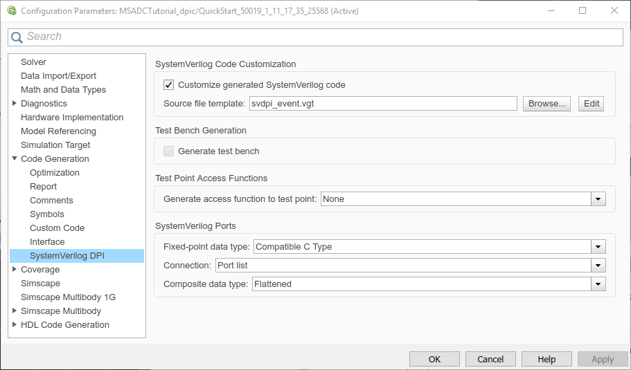 The second step is to specify the target for generating C code. This can be done by navigating to Code Generation tab on the model configuration parameters window opened in the first step. You choose SystemVerilog DPI Component Generator as the System Target File. You can choose the target for a generic real time (GRT) target or embedded real time (ERT) target. The latter option provides more alternatives for c-code optimization and customization.