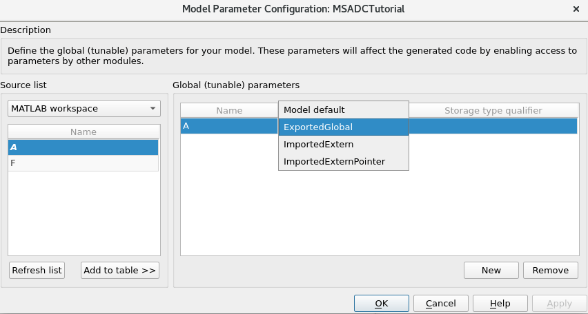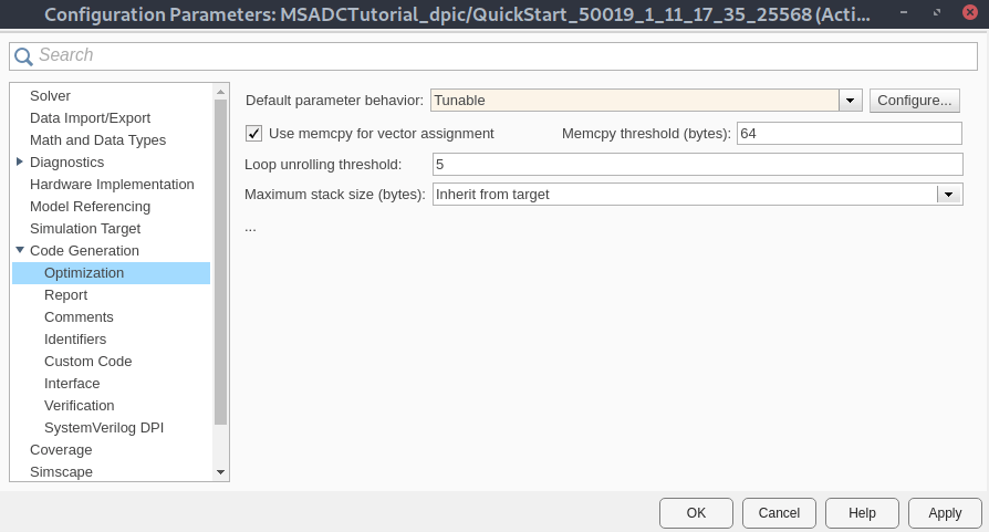 Click on "Configure" from the Optimization tab under Code Generaration to configure the tunable parameters. The Sine Source block specifies two tunable parameters: A, representing the amplitude of the sinusoidal excitation, and F, representing its frequency. You define the two parameters to use "ExportedGlobal" storage class. This makes sure that A and F will be tunable parameters also in the generated SystemVerilog module.