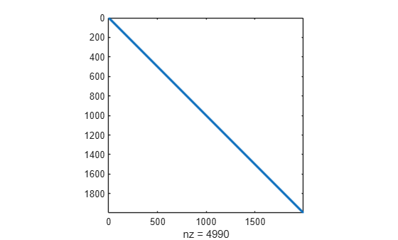 Plot the sparsity pattern of matrix A. Most of the nonzero elements are close to the main diagonal.