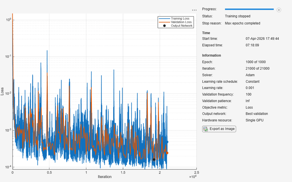if doTraining [net,info] = trainnet(UTrain,VTrain,layers,"l2loss",options); else fprintf("Downloading network... ") filenameNetwork = matlab.internal.examples.downloadSupportFile("nnet","data/BatteryModuleCoolingNetwork.mat"); load(filenameNetwork) show(info) fprintf("Done.\n") end