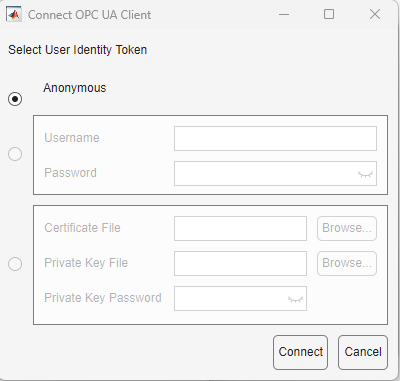 Simulink model and connect to the OPC UA server by clicking Model Settings > OPC Configuration. Select your OPC UA server and click Connect. Select Anonymous and click Connect.Right-click the