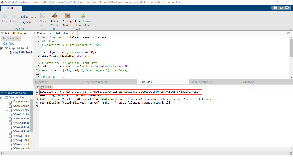 deploy(board,'raspi_fileRead_resnet')The deploy function initiates code generation of the raspi_fileRead_resnet function.