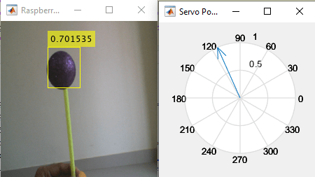 A camera window opens with the ROI and the probability of match with the training network. A separate window opens to display the angle of the servo motor.