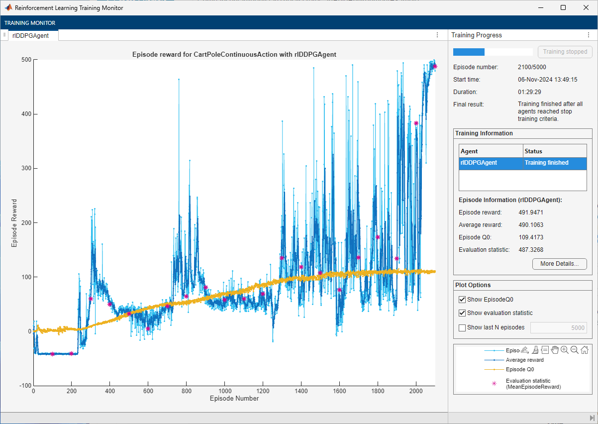 trainOpts = rlTrainingOptions(... MaxEpisodes=5000, ... MaxStepsPerEpisode=500, ... StopTrainingCriteria="EvaluationStatistic",... StopTrainingValue=480);