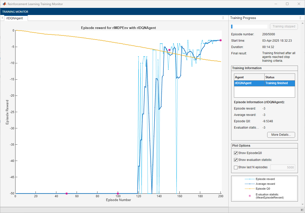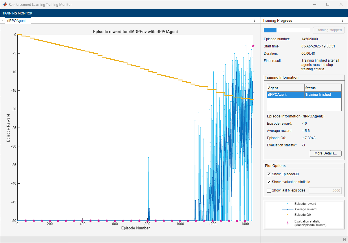 Train the agent, passing the previously created evaluator object to train. Training is a computationally intensive process that takes several minutes to complete. To save time while running this example, load a pretrained agent by setting doTraining to false. To train the agent yourself, set doTraining to true.