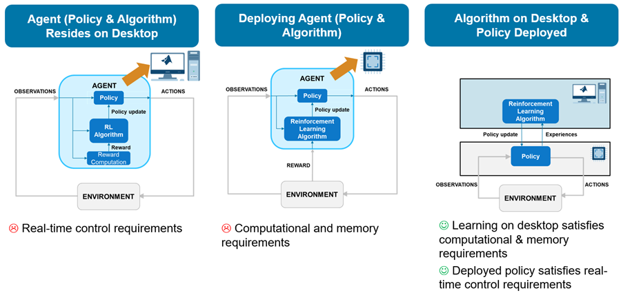 The problem with this second approach is that a typical dedicated controller board lacks the memory and computational power necessary to run the agent learning algorithm, especially for off-policy agents. In other words, this second approach might be feasible only by using a very powerful on-board computer with an appropriately capable data acquisition board.
